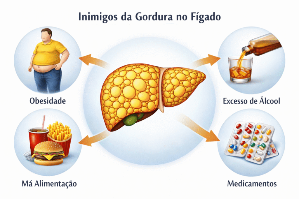 A esteatose hepática é multifatorial. Entre os principais fatores estão: