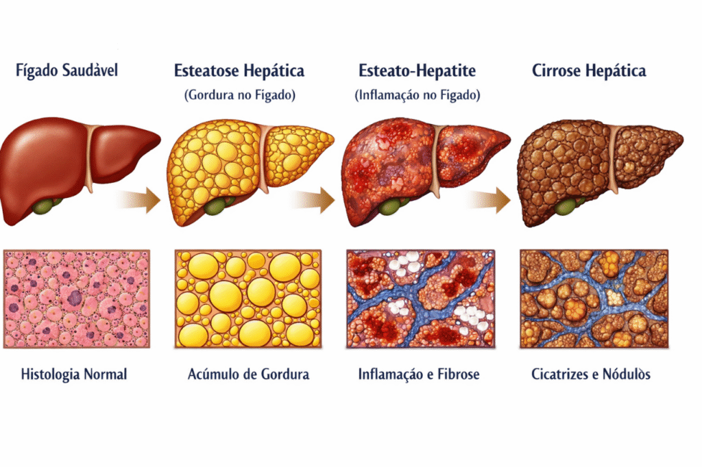 Gordura → Inflamação (MASH) → Fibrose → Cirrose
